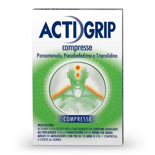 Ipersensibilita' ai principi attivi, ad altri antistaminici o ad uno qualsiasi degli eccipienti elencati al paragrafo 6.1. Bambini di eta' inferiore ai 12 anni. Durante la gravidanza e l'allattamento (vedere paragrafo 4.6). Pazienti in trattamento con inibitori delle monoaminossidasi (IMAO) o nelle due settimane successive a tale trattamento. In tali casi l'uso concomitante di Actigrip puo' causare un aumento della pressione sanguigna o crisi ipertensive (vedere paragrafo 4.5) e nellaterapia delle affezioni delle basse vie respiratorie, compresa l'asmabronchiale. L'associazione con farmaci simpaticomimetici indiretti, alfa simpatico mimetici (per via orale e/o nasale) (vedere paragrafo 4.5Interazioni con altri medicinali ed altre forme d'interazione). Per isuoi effetti anticolinergici non utilizzare in caso di glaucoma, nell'ipertrofia prostatica, nell'ostruzione del collo vescicale, nelle stenosi piloriche e duodenali o di altri tratti dell'apparato gastroenterico ed urogenitale. Pazienti con preesistenti malattie cardiovascolari, in particolare quelli con malattie coronariche, ipertensione e patologie tiroidee. In pazienti con storia di ictus o che presentano fattori di rischio per l'ictus, a causa dell'attivita' alfa-simpaticomimetica del vasocostrittore. Epilessia, diabete. Gravi affezioni epatiche erenali. I medicinali a base di paracetamolo sono controindicati nei pazienti con manifesta insufficienza della glucosio-6-fosfato deidrogenasi ed in quelli affetti da grave anemia emolitica. Grave insufficienzaepatocellulare.