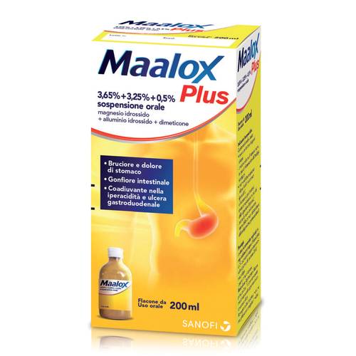 Maalox Plus 3,65% + 3,25% + 0,5% sospensione orale. Posologia: non superare le dosi massime indicate se non su prescrizione medica. Ingerire2-4 cucchiaini (10-20 ml) 4 volte al giorno, 20-60 minuti dopo i pasti e prima di coricarsi. Modo di somministrazione: agitare bene prima dell'uso. Puo' essere diluito in acqua o latte. Maalox Plus 200 mg + 200 mg + 25 mg compresse masticabili. Posologia: non superare le dosi massime indicate se non su prescrizione medica. 2-4 compresse 4 volte aldi' ben masticate o succhiate, 20-60 minuti dopo i pasti e prima di coricarsi. Modo di somministrazione: le compresse devono essere ben masticate o succhiate. La loro assunzione puo' essere seguita da ingestione di acqua o latte. Popolazione pediatrica: non e' raccomandata la somministrazione del medicinale in eta' pediatrica.
