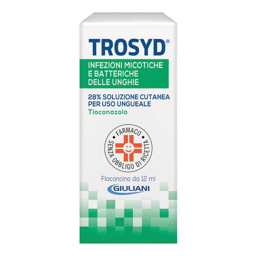 Trosyd 1% crema; 1% polvere cutanea; 1% emulsione cutanea. Dermatomicosi causate da dermatofiti, lieviti ed altri miceti sensibili al tioconazolo. Infezioni cutanee provocate da batteri Gram-positivi sensibilial farmaco. Per la concomitante attivita' antimicotica e antibatterica, e' particolarmente indicato nelle infezioni cutanee miste. Trosyd 28% soluzione cutanea per uso ungueale. Onicomicosi causate da dermatofiti e lieviti. Per la concomitante attivita' antibatterica, e' particolarmente indicata nelle infezioni delle unghie miste. Trosyd 1% soluzione cutanea. Trattamento antimicotico topico delle infezioni cutanee causate da miceti (dermatofiti e lieviti), anche se associate a sovrainfezioni da batteri Gram-positivi sensibili al medicinale, come coadiuvante alla terapia con altre preparazioni topiche specifiche. La soluzione cutanea permette una maggiore facilita' di applicazione nelle dermatomicosi piu' estese ed esplica una detersione medicata della cute glabra o pelosa. Inoltre, consentendo il trattamento di un'ampia superficie cutanea, rende possibile l'eliminazione dell'agente patogeno non solo dove sono rilevabili variazioni morfologiche cutanee ma anche dovela cute e' apparentemente sana.